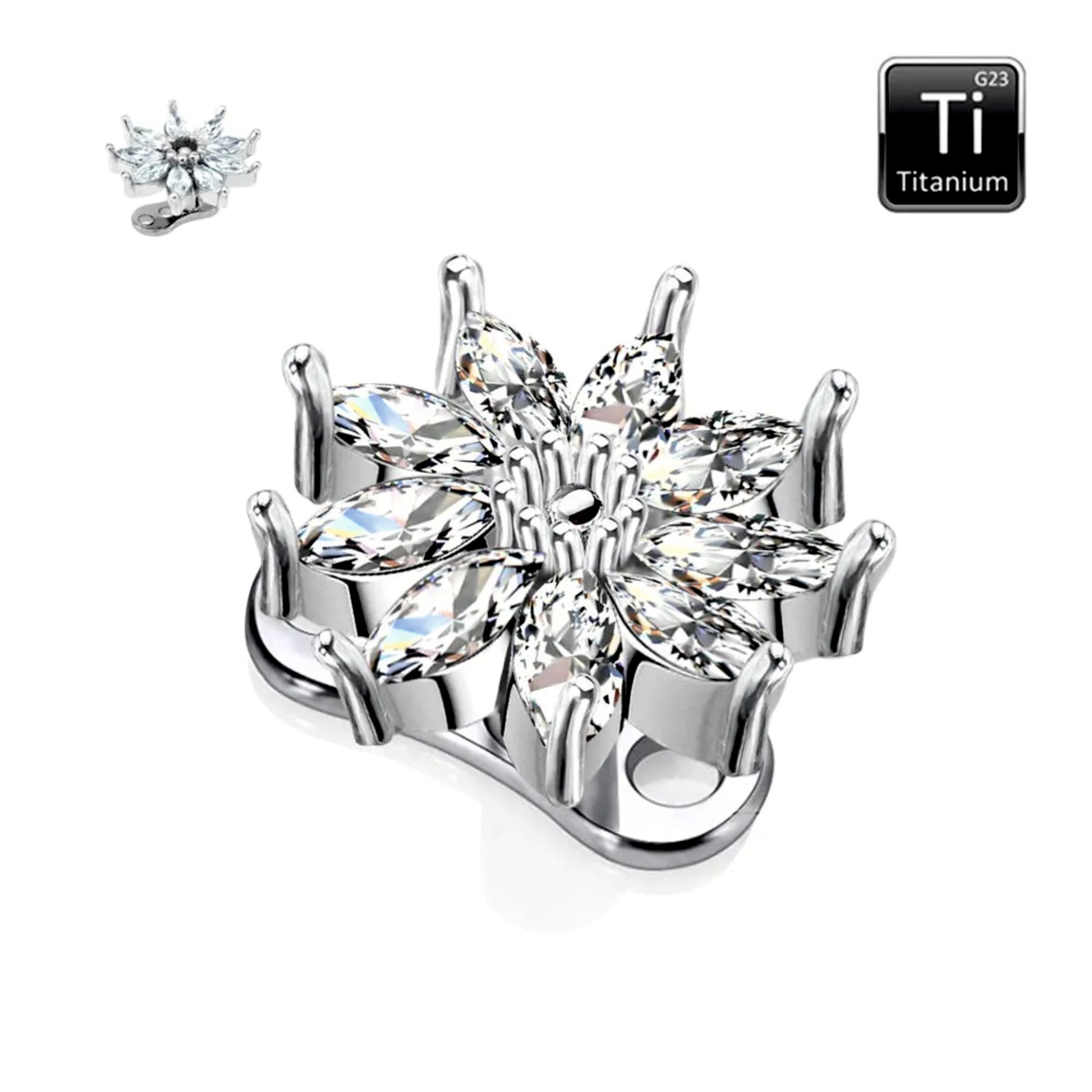 - Materiale: titanio G23, fiore in acciaio chirurgico, gioielli anallergici e senza nichel